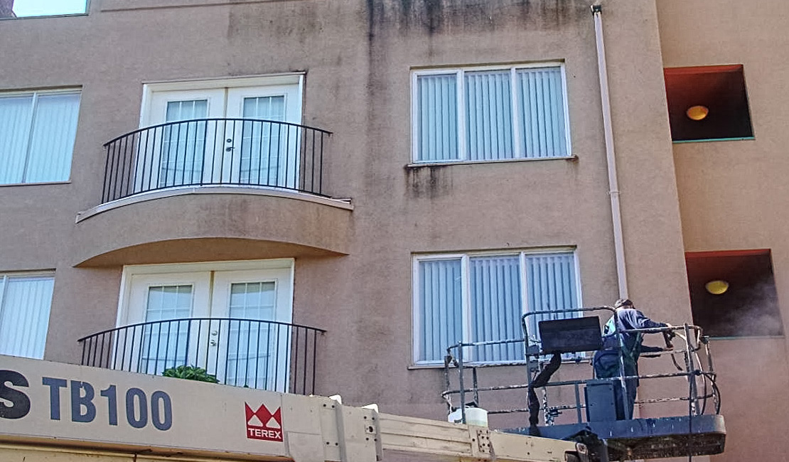 We apply environmentally safe solutions and use the mildest dilutions to achieve the desired results. This is followed by a steam/ hot water low pressure rinse, cleaning from the bottom up, and rinsing from the top down.
